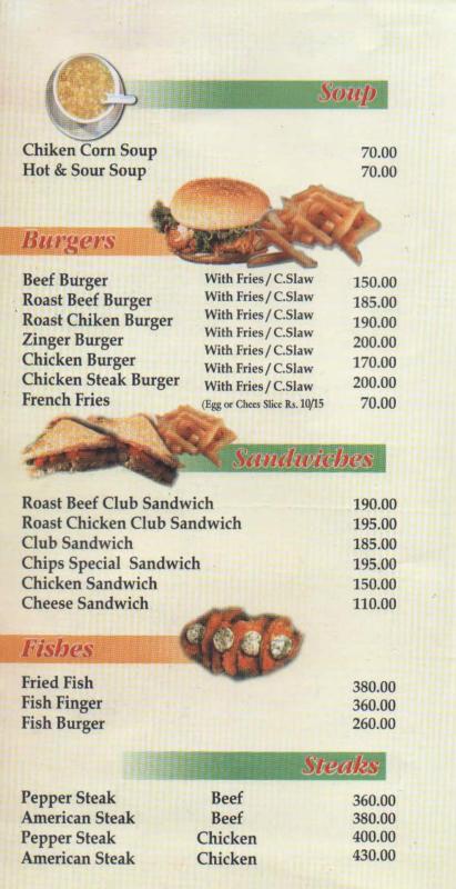 Chips Restaurant Karachi offers much mouthwatering taste of Burgers, sandwiches, Fishes, Steak, Pizza, Chicken, Kabab Rool+BBQ, Karahi and more in ver Read More