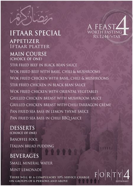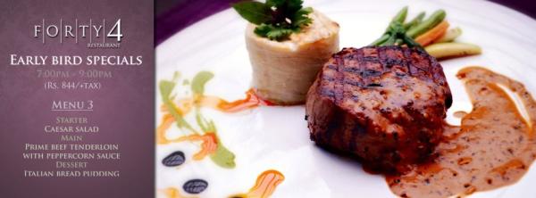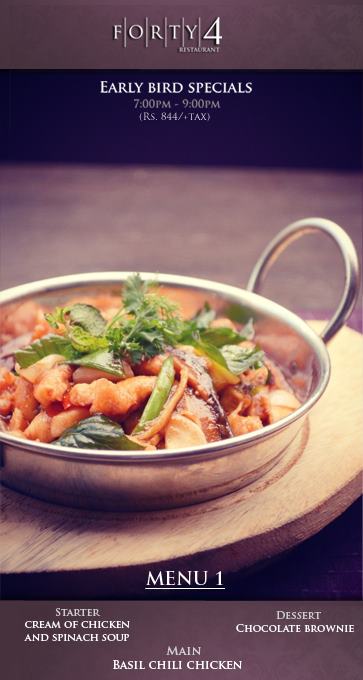 Forty4 Restaurant Karachi is one of the ideal eating out place of Karachi. Forty4 restaurant has been designed to engage all types of diners –A room designed specially for non-smokers, The atrium for exclusive corporate lunches and parties, The Lounge for a more relaxed sports evening - whilst the main dining area is a buzz of activity serving up platter after platter of exotic & unusual fusion cuisine. Another new concept brought by the Forty 4 team is the Space – an art gallery style room basically a blank canvas which this talented team transforms into different themes – from cigar lounges & bars to a conference room complete with multi media – give them a theme & they will not disappoint. So lets come and enjoy the delicious taste of foods from the menu of Forty 4 restaurant Karachi with some exclusive deals and offers.