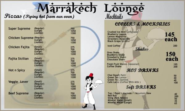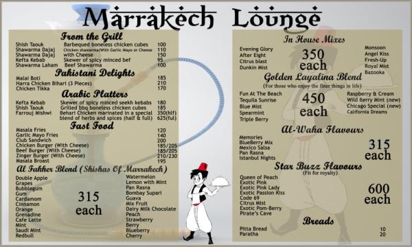 Marrakech Shisha Lounge Restaurant Karachi offers the taste for music, art, and mouthwatering food all come together under one roof in the vibrant atmosphere. The dining ambience in true Arabic tradition is aimed at pleasing all the senses whether you want to eat a delicious shawarma, indulge in an exotic mocktail or enjoy a favorite flavor shisha, Marrakech is the best place for you. Marrakech offers a select range of appetizers, tea, coffee, juices and mocktails as well as a great range of fruity flavored shishas prepared with high quality. So let’s come towards Marrakech Shisha Lounge and enjoy delicious foods from its menu with some exclusive deals and discount. Restaurant timing: Mon - Thu: 9:30 am - 12:30 am, Fri: 9:30 am - 1:00 am, Sat: 1:30 pm - 2:00 am, Sun: 1:30 pm - 1:00 am