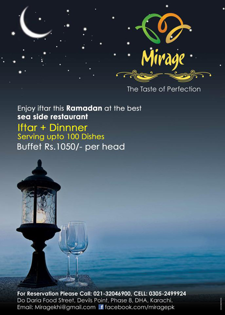 Mirage Buffet Restaurant Karachi serves the delicious taste of Soup, Bar-B-Q, Chinese & Thai foods, Pakistani & Mughlai Cuisine, Snacks, Salad & Chati Read More