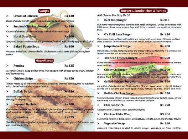 O's Bistro Restaurant Karachi is a Casual Dining Elegant Family Restaurant situated in the center of Karachi at main Shahra-e-Faisal. O's Bistro Restaurant Menu contain Buffalo Chicken Burger, Buffalo Chicken Strips, O's Chilli Lava Burger, Steak with Caramalized Onions, Stuffed Steak with Tarragon Sauce, Steak with Mushroom Sauce and chinese, desserts, soupe, appetizers and much more. So lets come towards O's Bistro Restaurant Karachi and enjoy some delicious taste of foods with some exclusive deals and offers.