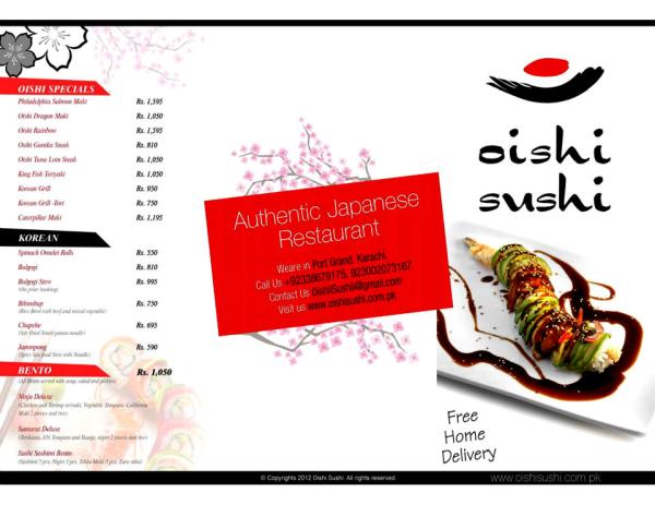 Oishi Sushi Restaurant Karachi offers some delicious taste of Japanese & Korean Cuisines in a very reasonable price under a very comfortable, well-designed friendly and family oriented environment. Oishi Sushi Restaurant is a situated at F 73/4 , Swiss Cottage, Block 4, Clifton, Karachi. The atmosphere is very pleasant and calm with a fine and stylish interior decoration. So let’s enjoy the recipes of Oishi Sushi Restaurant with some special deals & menu as well.
