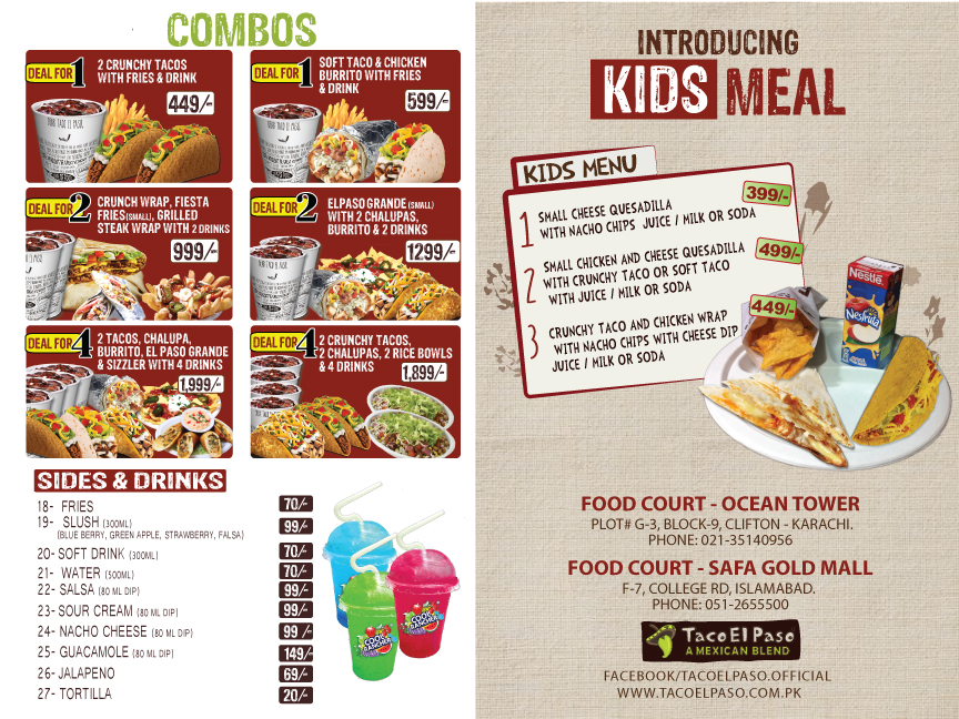 Taco El Paso Restaurant opened at Delton DHA-Karachi, The idea was simple; provide a different food and aims to educate diners about what Mexican-American food truly is.The most exciting of these recent additions to Islamabad’s gastronomic scene is the opening of its first Franchise of Taco El Paso, in the capital of Pakistan. So lets come towards Taco El Paso Restaurant Karachi & have a taste some awesome Mexican-American flavors and culinary sensibilities of Mexican eatery to the Pakistan from their menu with some exclusive deals and discount.