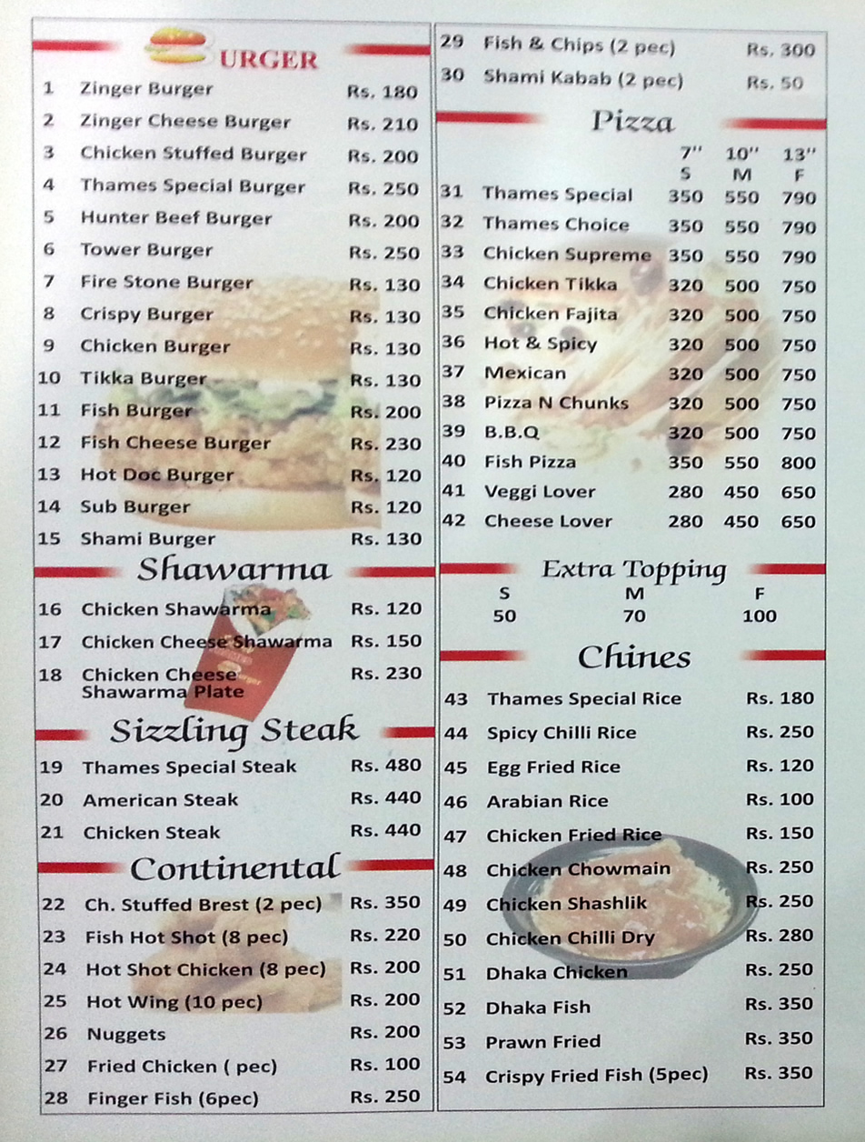 Thames is one of the leading fast food point in Khyber Pukhtunkhwa. It evolved from a restaurant established in 1991 that served continental cuisine, later into a wedding hall and now a hanging out point for every age group and social and economic status. In the heart of the city , with huge hall and magnanimous parking lot , with a departmental store at onside and other utilities at the other side, ideal for eating out and shopping in one area.